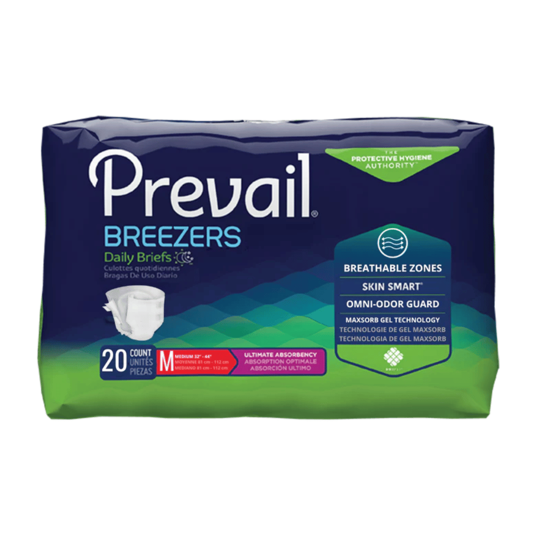 Prevail® Breezers® 360 Briefs deliver ultimate absorbency and skin-friendly comfort for individuals managing heavy bladder or bowel incontinence. With breathable zones and a soft, cloth-like exterior, these briefs promote dryness and air circulation. Their advanced core technology locks in moisture and neutralizes odor for long-lasting confidence.